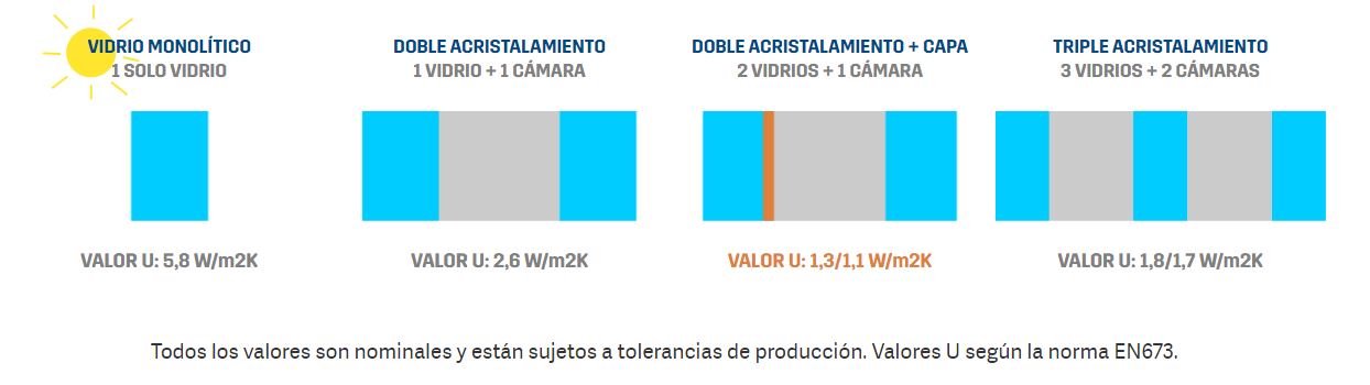 Cuanto MENOR sea el Valor – U, MENOR será el paso de energía entre ambas caras y por tanto mejor la capacidad aislante del elemento constructivo. Como demuestran los números un solo vidrio de capa mejora notablemente el aislamiento con respecto a otras composiciones con o sin argón, o incluso en triple acristalamiento.